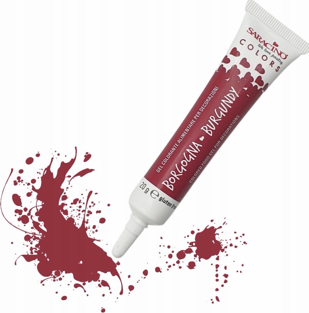 Barwnik spożywczy w żelu, w kolorze bordowym. Zapakowany w praktyczną, super wygodną do aplikacji tubkę! Barwnik wystarczy dodać do masy cukrowej lub kremu i odpowiednio wymieszać albo ugnieść. Dzięki niskiej zawartości wody łatwo wrabia się w masy cukiernicze. Nie zalecany do użycia z masami tłuszczowymi. Wysoka koncentracja barwnika sprawia, że jest on bardzo wydajny. Doskonale sprawdzi się przy wypieku ciast, muffinów, lodów, a także przy dekorowaniu tortów czy innych słodkości.