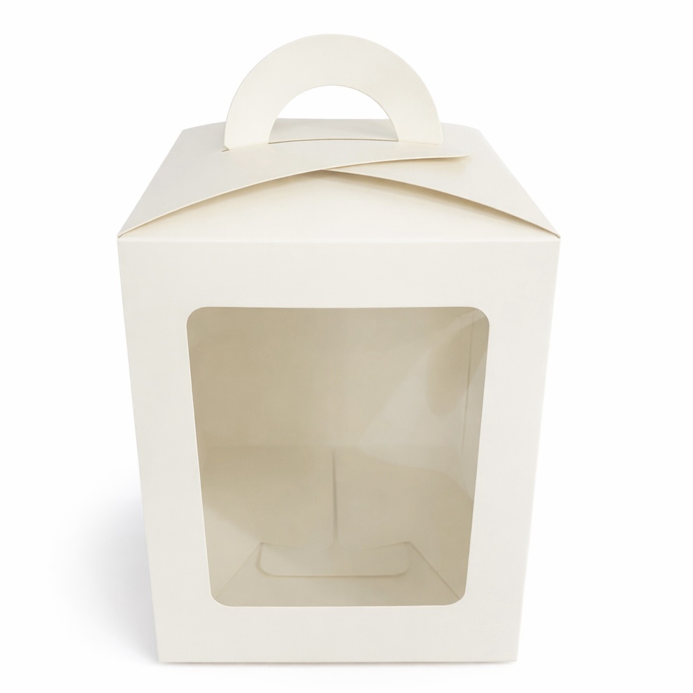 Eleganckie, białe pudełko z okienkiem, idealne do pakowania paski oraz babek wielkanocnych. Wyposażone w wygodny uchwyt ułatwiający przenoszenie. Stabilna konstrukcja zapewnia bezpieczny transport i estetyczną prezentację wypieków.