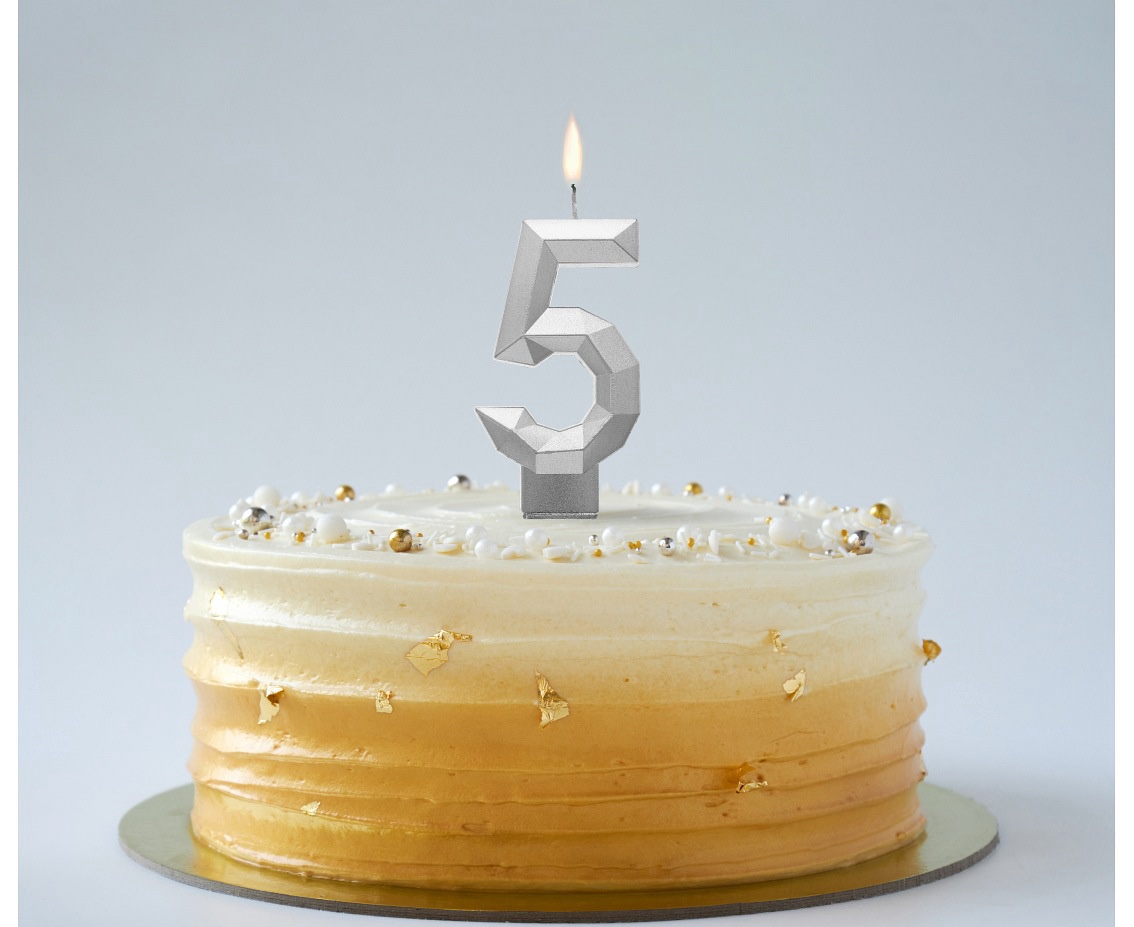 Świeczka Cyfra 5 – Diament, metalik srebrny, 7.6 cm