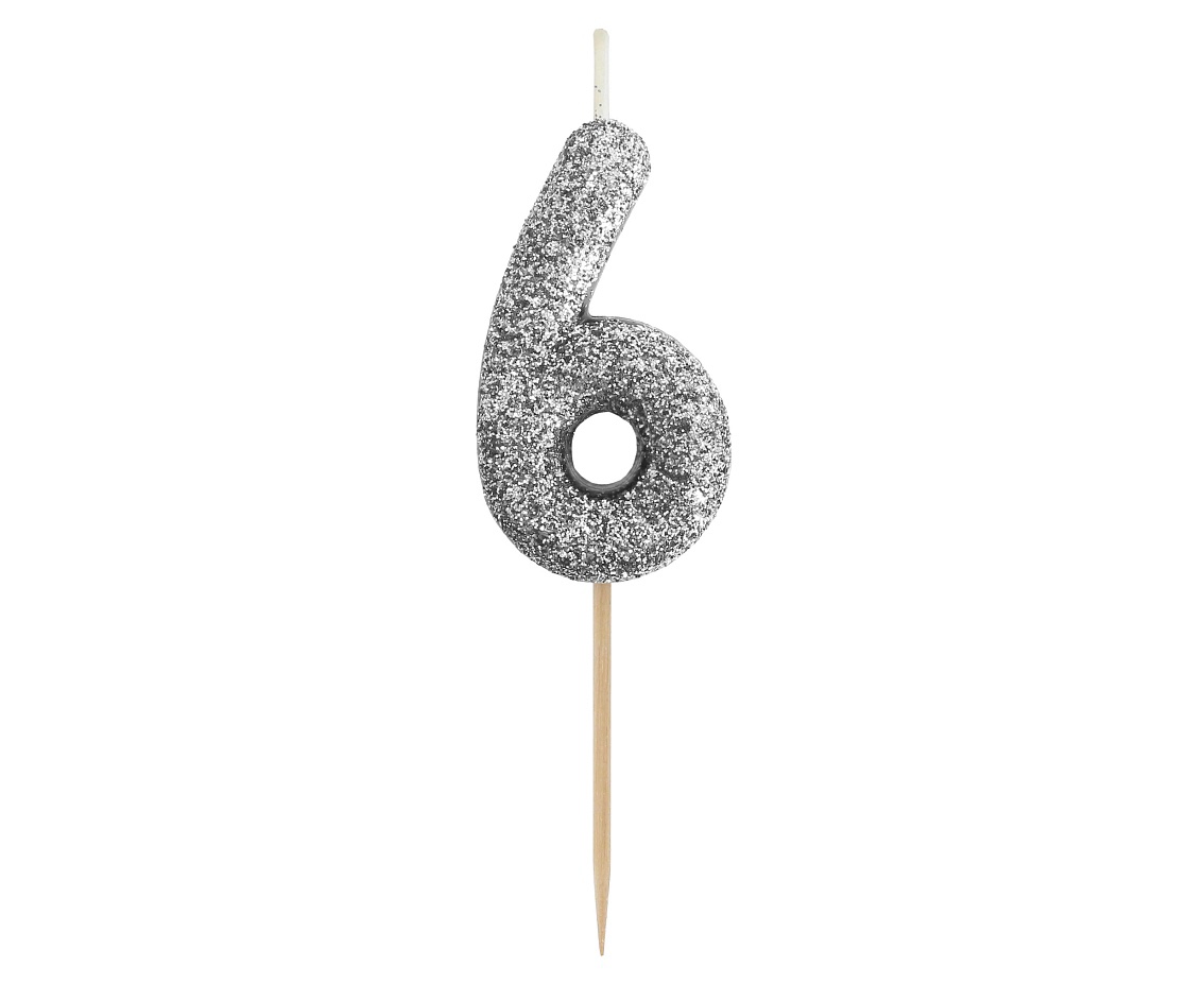 Świeczka Cyfra 6, brokatowa czarna, piker