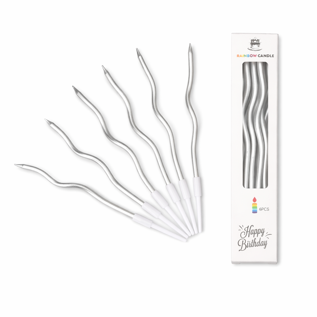 Eleganckie świeczki urodzinowe spiralne w metalicznym, srebrnym kolorze. Długi, skręcany kształt pięknie prezentuje się na torcie i nadaje dekoracji nowoczesny, stylowy charakter.
